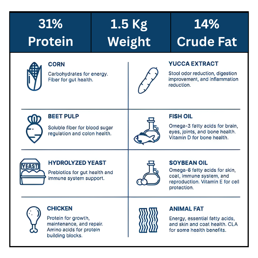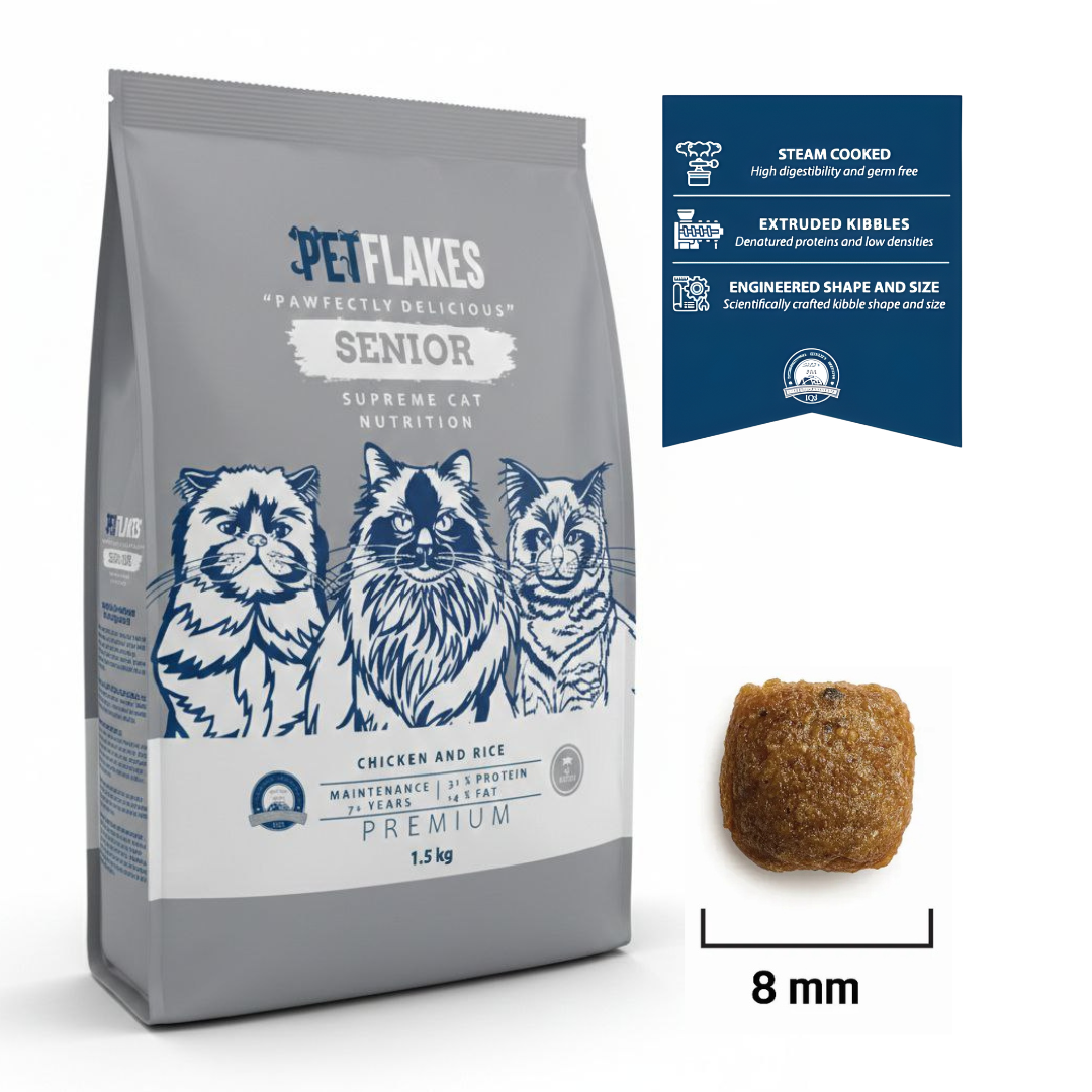 Petflakes Senior Chicken & Rice Dry Cat Food 1.5kg is specially formulated to support the changing nutritional needs of senior cats aged 7 years and above. With 31% protein and controlled fat levels (14%), this balanced maintenance formula helps preserve lean muscle mass while supporting healthy weight in older cats. Made with chicken and rice, it promotes easy digestion and is enriched with essential vitamins and minerals to help maintain vitality and overall wellbeing. Suitable for daily feeding for senior cats of all breeds. Available for fast delivery across Lebanon from Petcom.