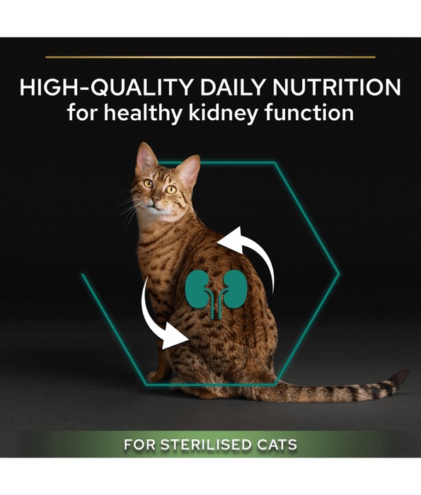 Support your sterilized cat's health and well-being with Purina Pro Plan Sterilised Adult Renal Plus Dry Cat Food. Specially formulated for neutered cats, this premium diet helps maintain a healthy weight, supports urinary health, and promotes optimal kidney function. Made with high-quality turkey as the #1 ingredient, this dry cat food delivers science-based nutrition with no added colorants or flavorings.