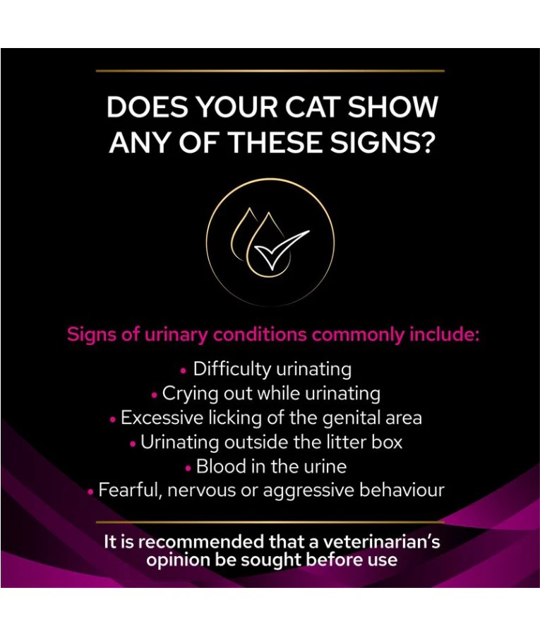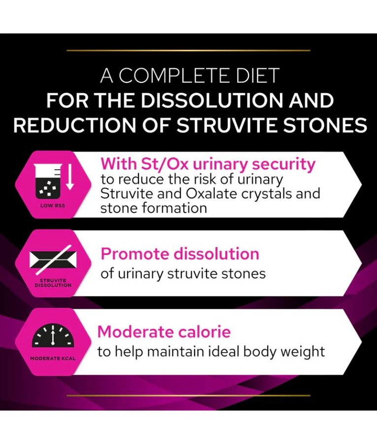 Purina® proplan® veterinary diets UR St/Ox Urinary is a complete veterinary diet for cats with urinary tract conditions. UR is specially formulated to help dissolve struvite urinary crystals and stones and helps reduce the risk of urinary stones recurring (struvite and calcium oxalate). It can also help nutritionally manage feline iodiopathic cystitis by increasing water intake and encouraging the production of dilute urine. UR contains nutrients such as omega-3 fatty acids and natural sources of glycosaminoglycans which help support the health of the urinary tract.